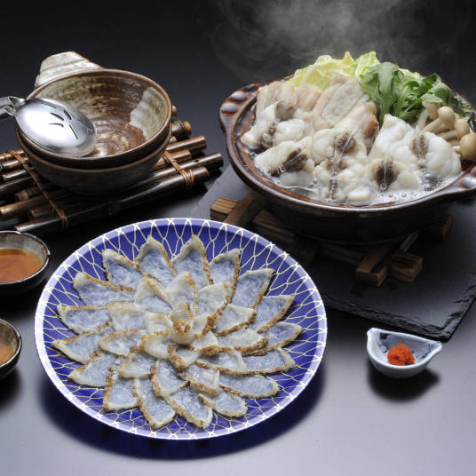 山口県萩沖で水揚げされた活〆天然マフグ身の表面を強火でサッと炙り、うま味と新鮮さを閉じ込め熟練の職人が丁寧に刺身に仕上げました。外は香ばしく、中はしっとりとした食感の炙り刺身と、旨味たっぷりで奥深い味わいの国産ふくちり。ちり鍋の後の残ったダシで作る雑炊もお楽しみいただけます。
