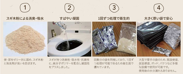 災害が起きにくい森林環境づくりに貢献したい、そしてもしもの時にはみなさまの衛生環境確保に役立ちたい。そのような思いにスギの力を活用できるのではないかと考え製品開発をしました。地域材・リサイクル材の活用により、森林保全、減災、環境負荷低減、循環型社会構築への貢献を目指しています。