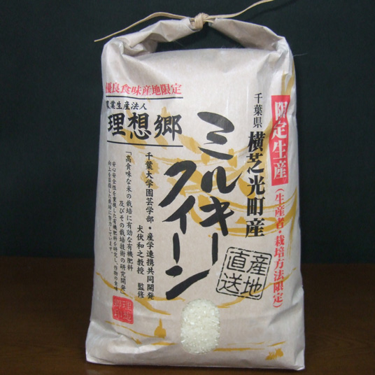 平成30年 米・食味分析鑑定コンクール国際大会で金賞を受賞した理想郷のお米「ミルキークイーン」です。千葉大学大学院園芸学研究科と肥料や栽培技術を共同研究し育てた「ミルキークイーン」は、低アミロース米のため粘りが強いのが特徴です。また、タンパク質を抑えているので、味が濃く、「甘いお米」とコンテストでも評価をいただいています。理想郷の自慢のお米を、ぜひご賞味ください。理想郷の自慢のお米を、ぜひご賞味ください。
