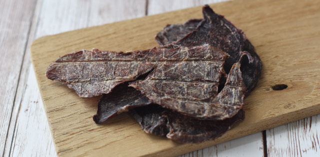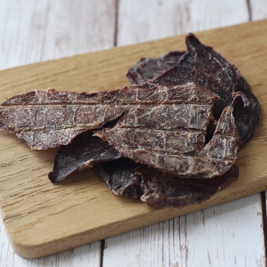 国産シカ肉の最高級部位と言われる背ロースのみを使用した、高タンパク・低カロリーのジャーキーです。塩分や余計な味付けはせず、シンプルながらも上質なシカ本来の風味があります。