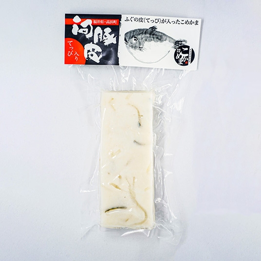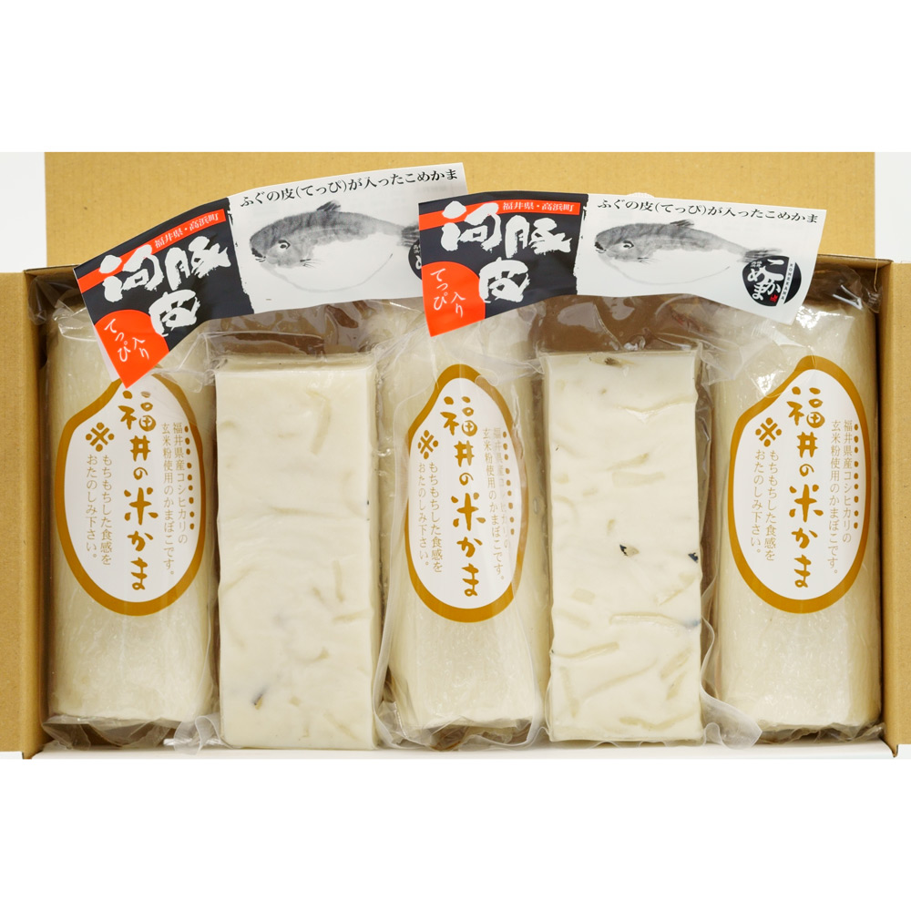 契約農家の栽培した福井県産コシヒカリを練り込んだ蒲鉾「福井の米かま」と、その米かまに若狭高浜で畜養されるトラフグの皮を練り込んだ手作りの「米かま てっぴ入り」を詰め合わせました。