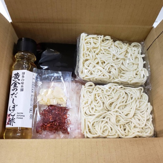 【内容量】2~3人前…国産牛白モツ300g、モツ鍋スープ4倍希釈250mL、ちゃんぽん麺2玉、にんにくスライス1袋、赤唐辛子1袋、黄金だしぽん酢200mL