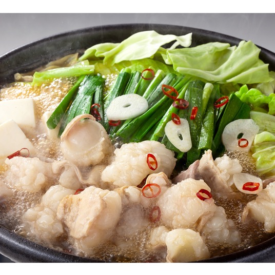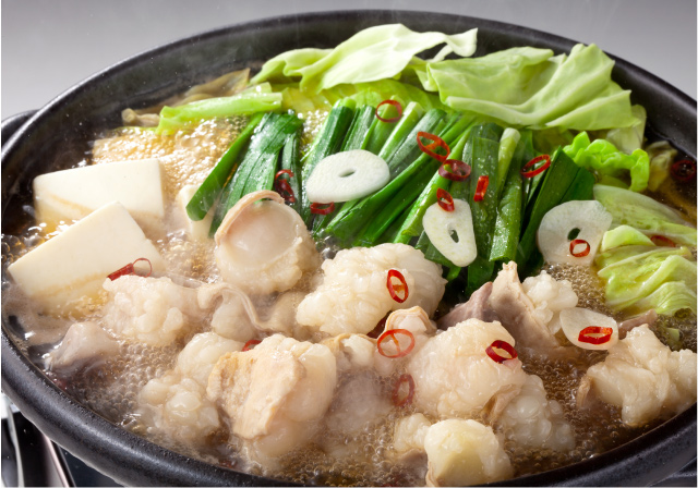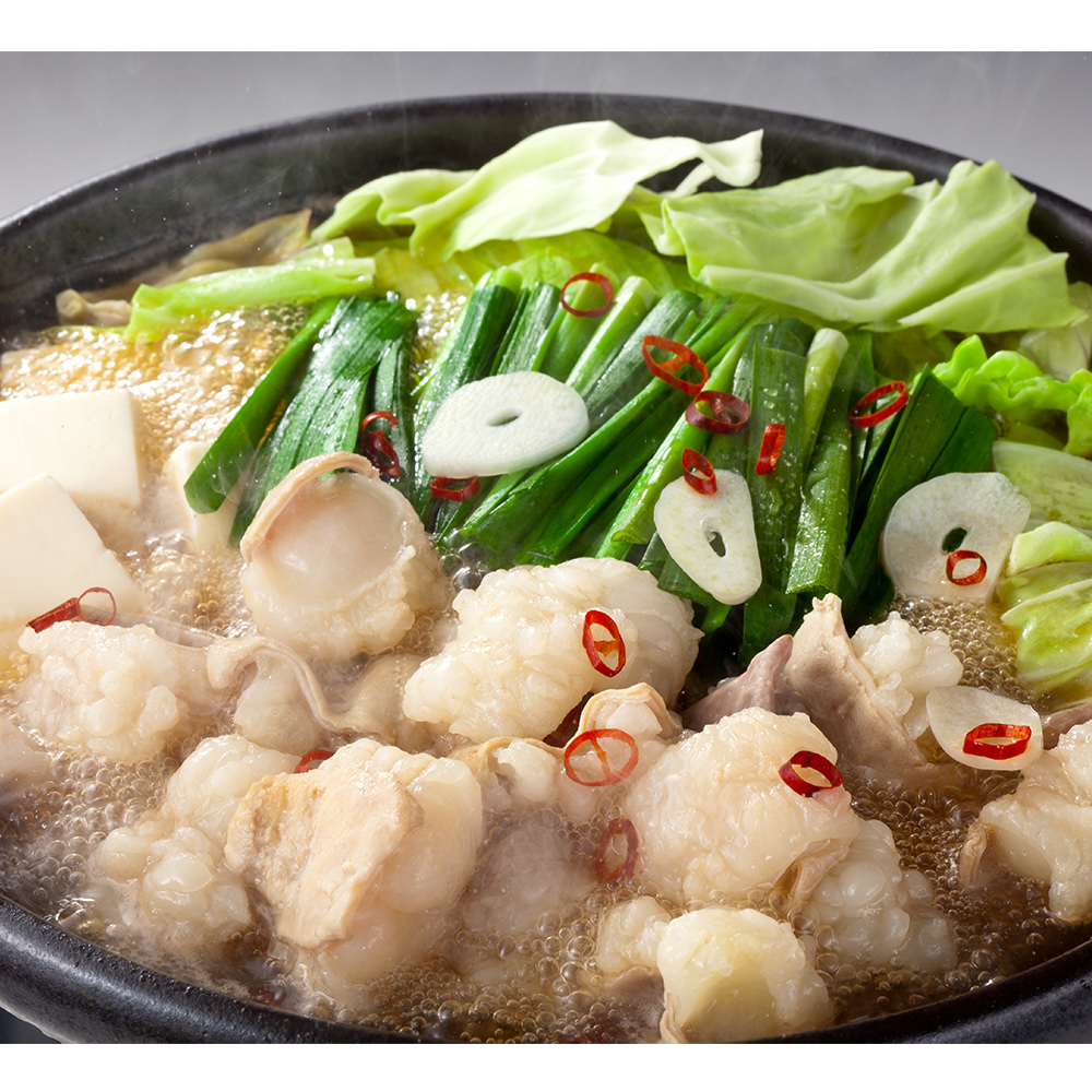 百年の歴史を持つ、博多を代表する名物故郷土料理「厳選国産牛博多もつ鍋」。九州でも珍しいモツの大問屋だから仕入れられる、厳選した国産牛のモツを使用しています。全体の仕入れの10%にも満たない希少な白モツは、臭いもなくピンク色に光りジューシーでうまみたっぷりのモツです。博多老舗の醸造元で仕込んだ特性スープは、モツのうまみをさらに引き立てます。