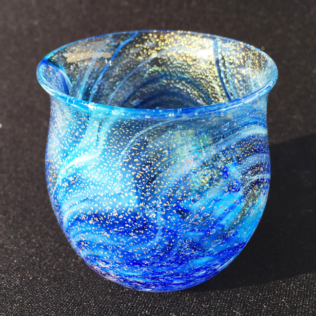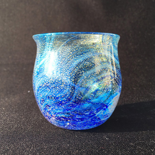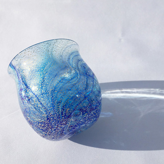 宙(ちゅう)吹きガラス技法にしかできない優しい表情を大切に、家族、笑顔、平和、自然などをテーマにした作品を作っています。「お客様の暮らしが少しでも楽しく豊かになれば嬉しいな」という思いで制作しています。すべて手作りの一点ものです。大切に末永く使っていただけるように、グラスであれば口当たりの薄さや角度にこだわりるなど、ひとつひとつ丁寧に仕上げています。