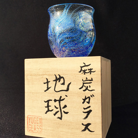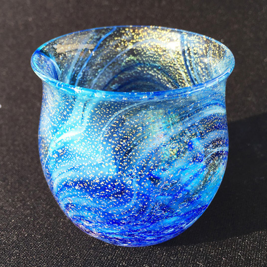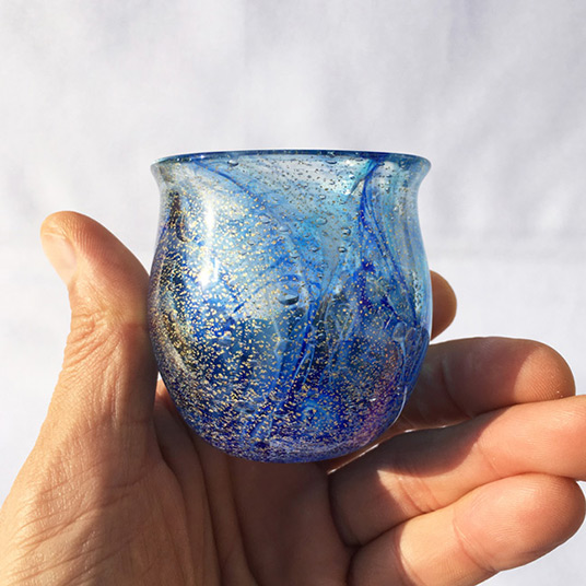 生命の源である地球をイメージした酒盃です。色ガラスが水のように流れ、混ざり合いながら偶然の模様になり、お互いの色を綺麗に引き立て合います。