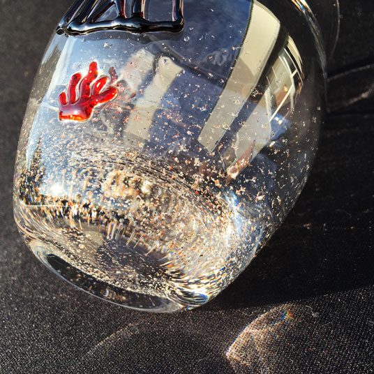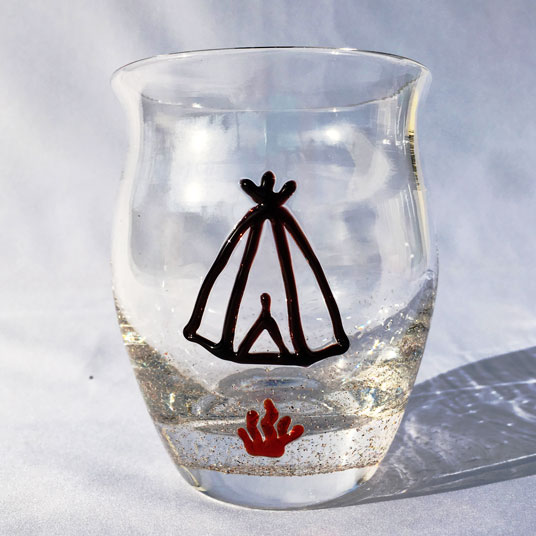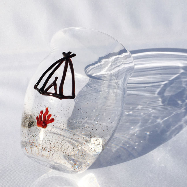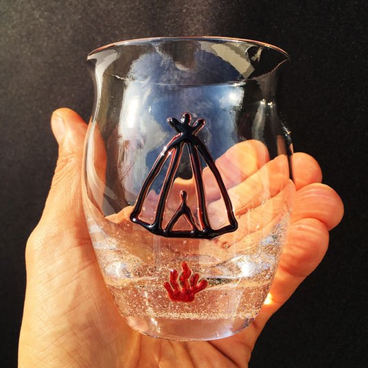 テントと焚火をモチーフに描いたグラスです。グラスの中に見える粒は、地元・横芝光町の屋形海岸の海砂をガラスに包み込んだものです。砂浜でのキャンプファイヤーをイメージしました。ロックグラスとしても使えるしっかりしたサイズ感ではありますが、女性やお子さまにも持ちやすいように下部は細身のデザインにしました。飲み口を外に広げ口当たりを滑らかにするとともに、全体の形状は内側に閉じることで、飲み物の香りを逃がさないようにしています。