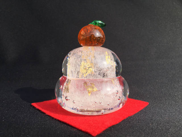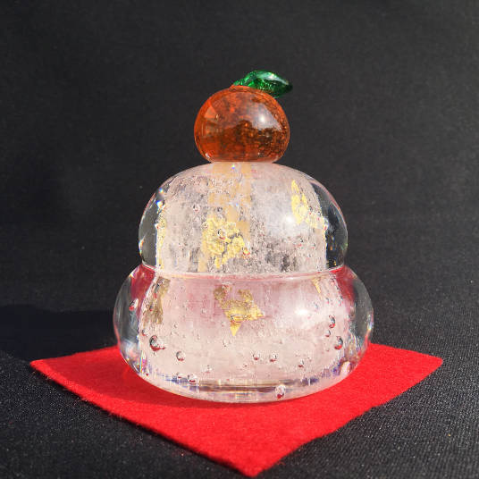 お正月にいたまない鏡餅はいかがですか? 「光」を感じることができるガラスで鏡餅を製作することで、新年を明るく楽しく過ごしていただきたいという願いを込めました。無垢(かたまり)のまま成形することで光を内包させ、揺るがないどっしりとした安定感と家庭円満を意味する柔らかい丸みのある形に仕上がります。さらに、いつまでも瑞々しく元気に過ごしてほしいという思いから、水を感じさせる気泡を用いて餅の白色を表現しました。ガラスの中には、一点一点手吹きで豪華な金箔を封入しています。代々末永くご使用いただける製品です。