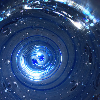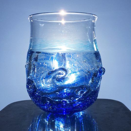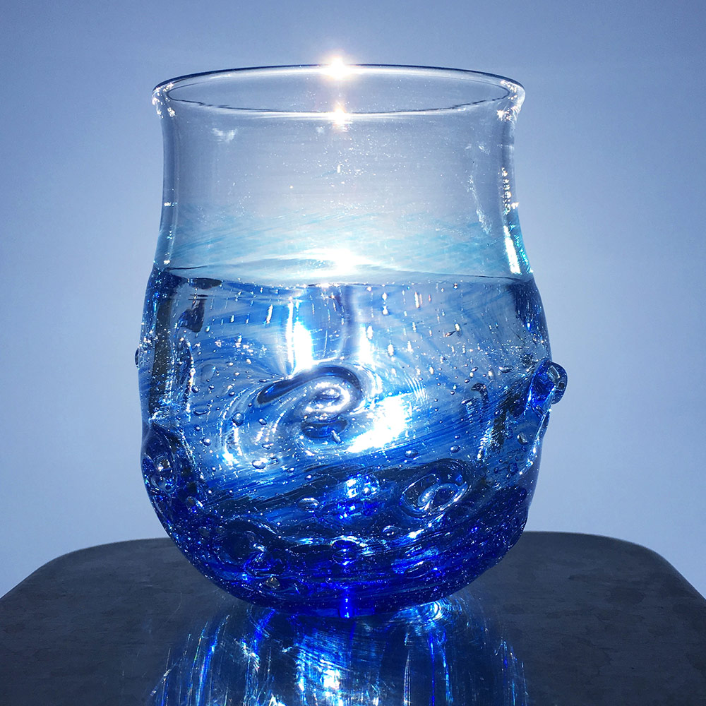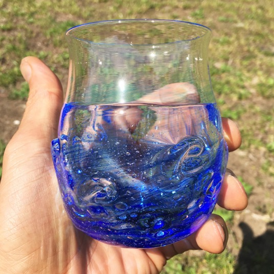 麻炭ガラスとは、熱いガラスに麻炭パウダーを振りかけ、さらにその上にガラスを巻き取り、麻炭を包み込むことで気泡を発生させている技法です。