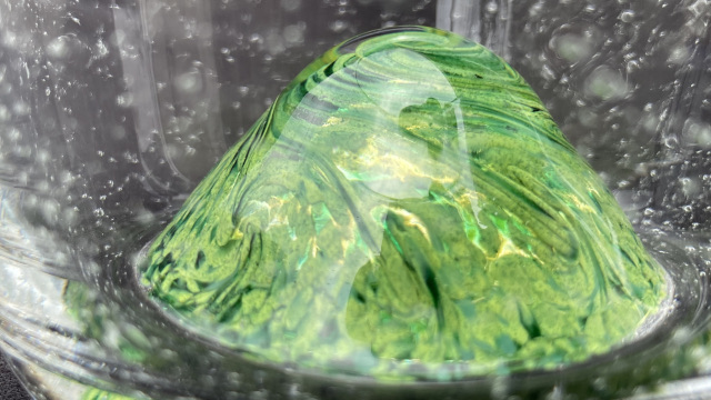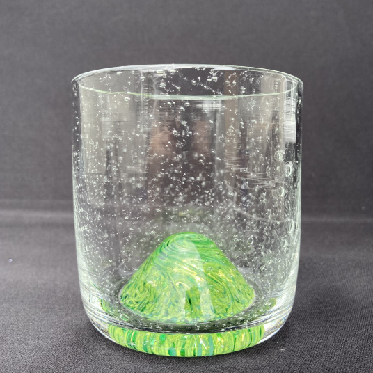 グラスの中にそびえ立つ山には、フォレスト、エメラルド、アヴェンチュリンという3種類のグリーン色ガラスをブレンドし、鉄の道具で渦模様にして、ぐぐぐっと山が隆起してくるような力強さをイメージしています。ガラスに見える気泡は、最高峰の山々が連なるヒマラヤ産のhempから作られた麻炭を使用して発生させています。