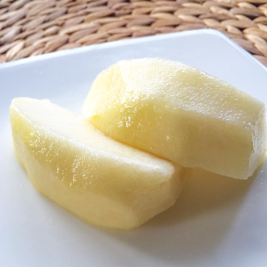 1. ラフランスは皮をむき、芯を取って、一口大に切ります。レモン汁を入れてあえます。