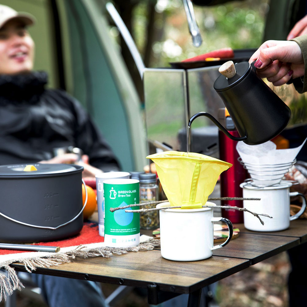 ドリップスタイルで淹れるお茶と、コンパクトに折り畳めて洗って繰り返し使える「O.D.コンパクトドリッパー2」(モンベル)のセットです。