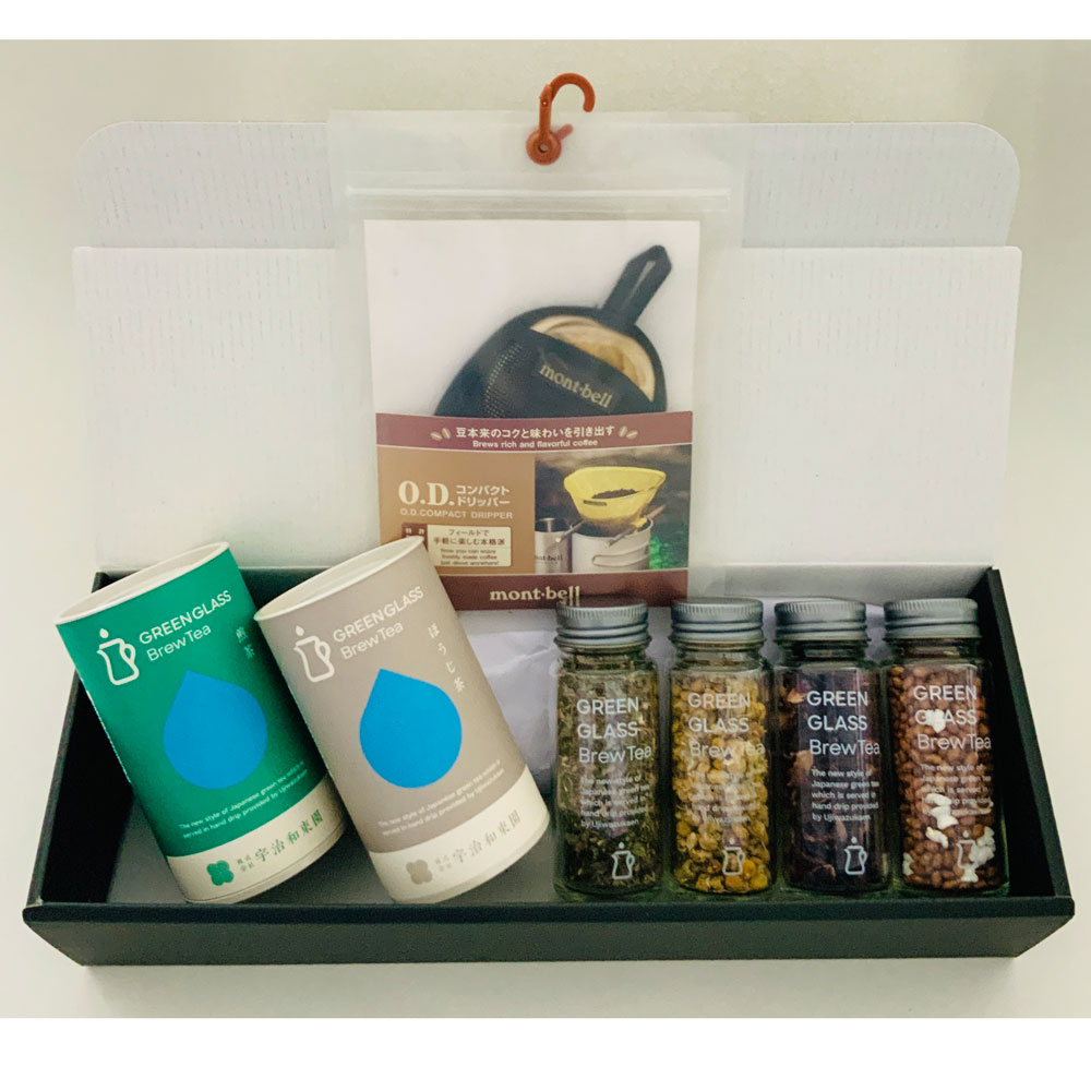 ドリップスタイルで淹れるお茶と、コンパクトに折り畳めて洗って繰り返し使える「O.D.コンパクトドリッパー2」(モンベル)のセットです。