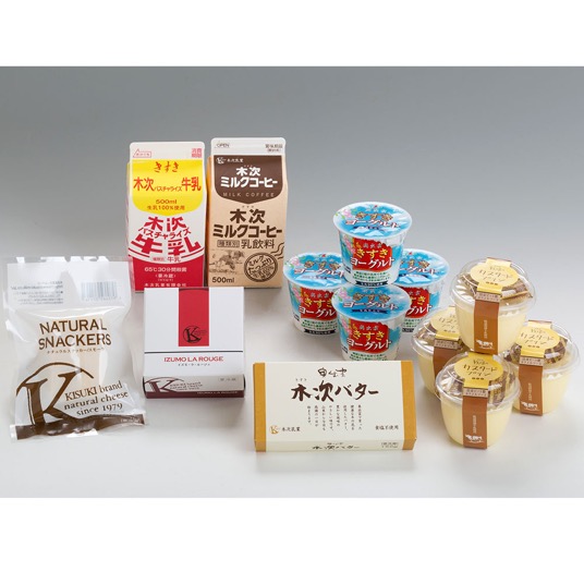 【内容量】牧場のカスタードプリン100mL×4、きすきヨーグルト90g×4、パスチャライズ牛乳500mL×1、木次ミルクコーヒー500mL×1、イズモ・ラ・ルージュ180g×1、ナチュラルスナッカー70g×1、木次無塩バター150g×1