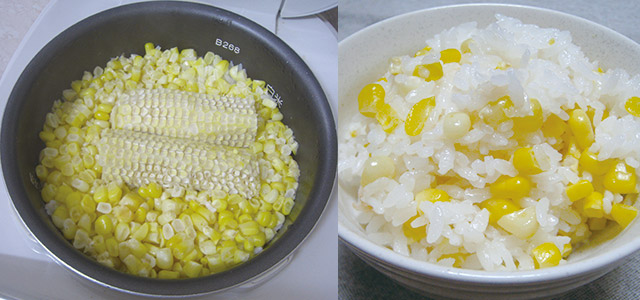 生のトウモロコシの実を包丁でそいで、芯も一緒に入れて炊飯器でお米と一緒に炊くだけ! 芯からいいダシ(甘み)が出ます。トウモロコシから水分が出るので、水加減はいつもより少し少なめに。