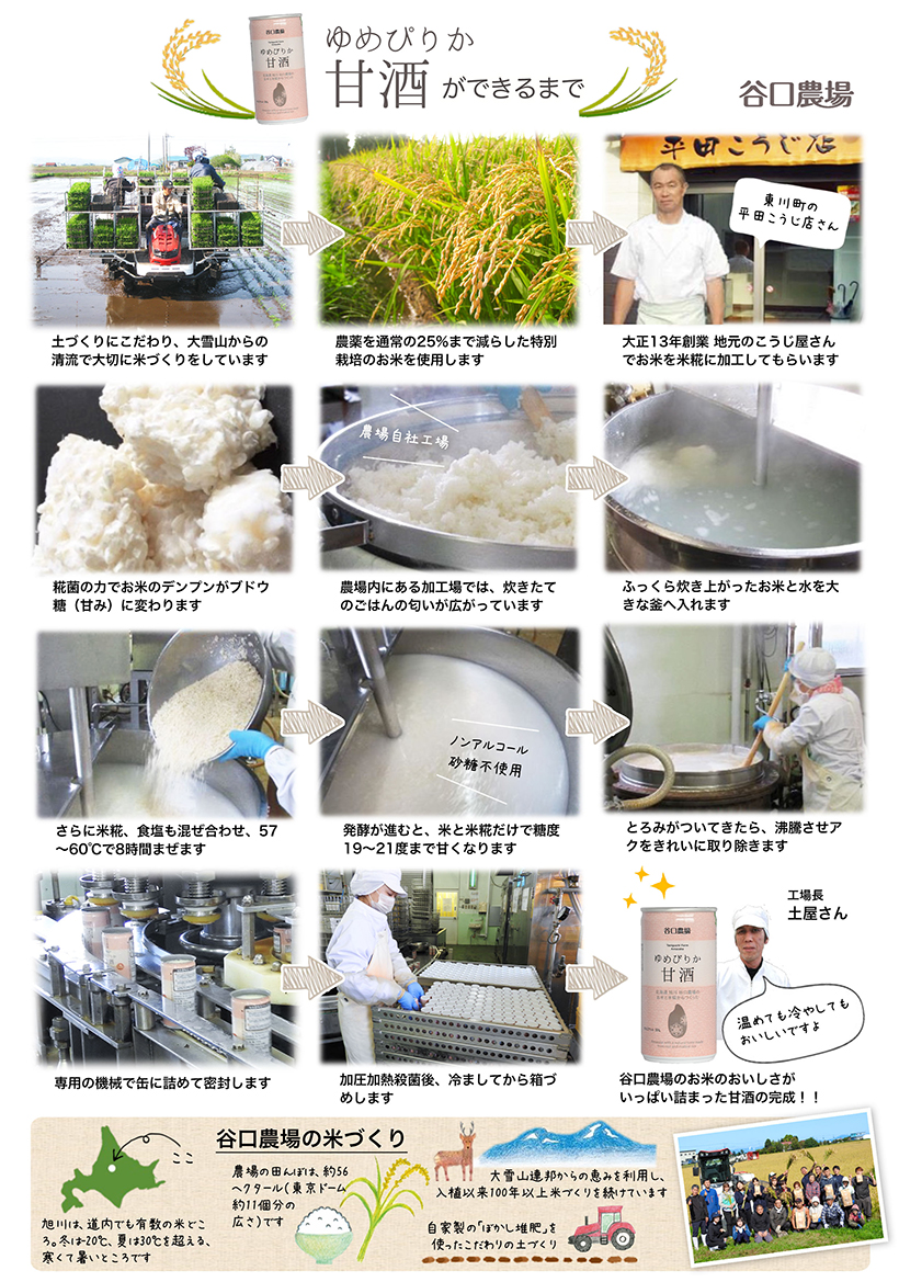 北海道旭川にある谷口農場産の特別栽培米「ゆめぴりか」と、米糀だけで作った甘酒です。