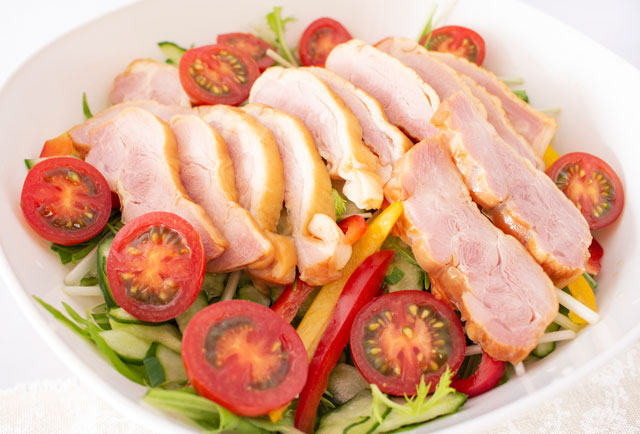 土佐はちきん地鶏は肉の厚みがあり、ふっくら、もっちりな弾力がある歯ごたえが特徴です。脂肪が少なくあっさりしているので、油と組み合わせた調理法や、淡白な味わいを生かした蒸し物がおいしくいただけます。
