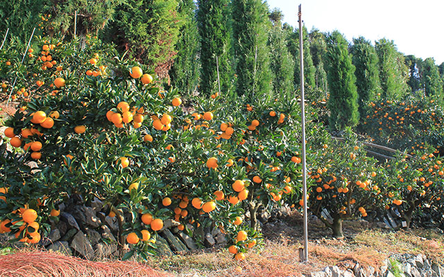 海岸付近から標高250メートルにまで至る山の斜面には石垣の段々畑が広がり、山の合間をミカン農家の白いトラクターが行き交います。初夏にはミカンの花のよい香りに包まれ、秋には畑全体がミカン色に染まり、四季折々の自然豊かな美しい風景が見られます。