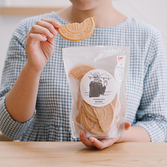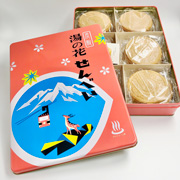 昭和32年創業。三重県菰野町(こものちょう)の湯の山温泉御在所岳の麓で、湯の花せんべいを始めとした観光土産菓子を製造・卸・販売 しています。「湯の花せんべい」は、味も創業当時のまま、無添加で作っています。昭和34年の御在所ロープウェイ開通を機に今の缶入になり、パッケージデザインはほぼ変わっていません。半世紀以上愛されるロングセラー商品です。モンベルのフレンドショップ御在所ロープウェイでも、お買い求めいただけます。
