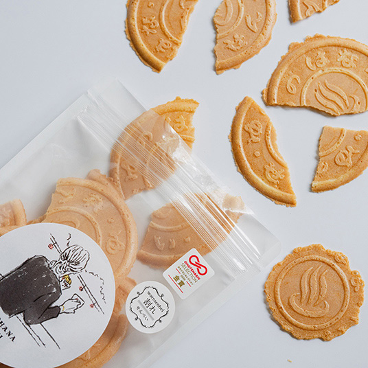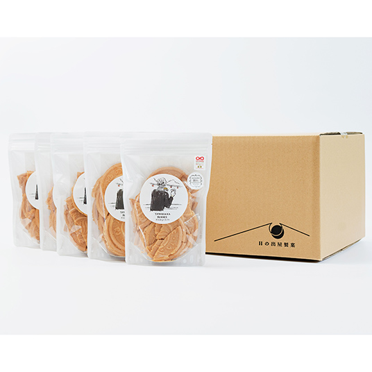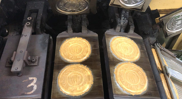 湯の花せんべい(炭酸せんべい)は非常に薄く割れやすいため、製造の現場でも1枚1枚焼成温度や生地の水分量を季節毎にこまめに調整しています。それでも1日1万枚程度作る工程の中で、どうしても割れたり欠けたりするおせんべいは一定量出てしまいます。せんべいの「耳」は手作業で削り、割れ欠けは選別して綺麗な正円のせんべいを缶入りにして製品化していますが、割れてしまったり欠けてしまったりした商品は味はもちろん変わりません。お好みの食べ方でお召し上がりください。
