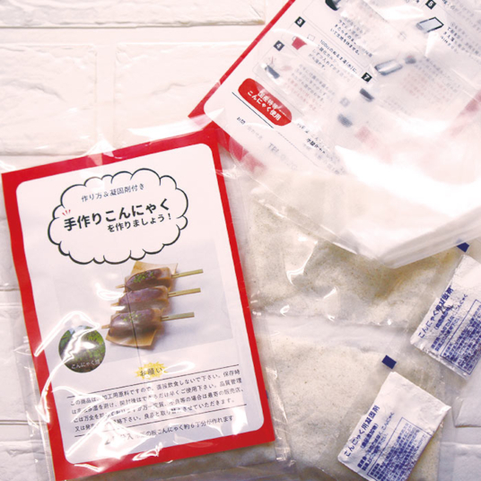 作り方と凝固剤付きなので、初めての方でも、自宅で手軽にこんにゃく作り体験ができます。