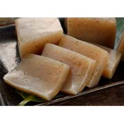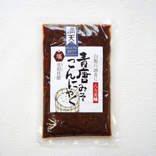 【素材】こんにゃく(国産こんにゃく粉)、海藻粉末(国産)、米みそ(大豆〔遺伝子組み換えではない〕、米、食塩)、砂糖、青唐辛子(国産)、発酵調味料(発酵原液、液糖、食塩)、 一味唐辛子、水酸化カルシウム、酒精