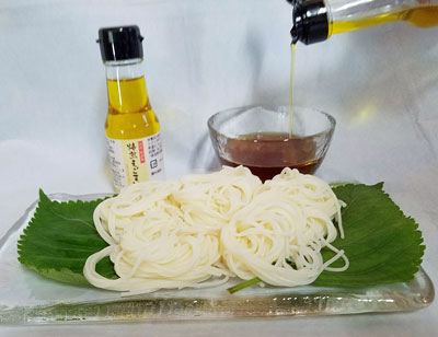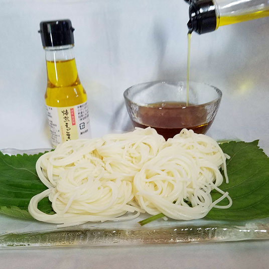 そうめんのつゆに焙煎エゴマ油を一垂らし。香ばしい香りが食欲をそそります。