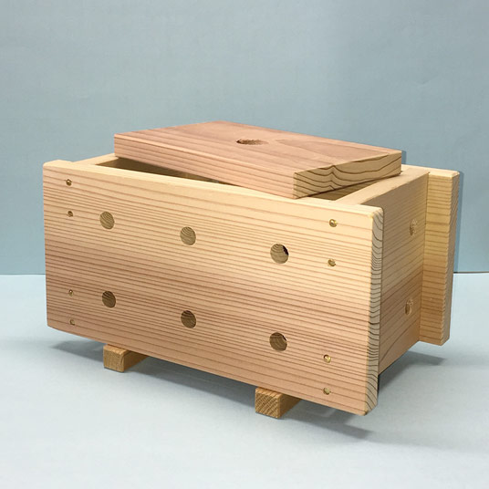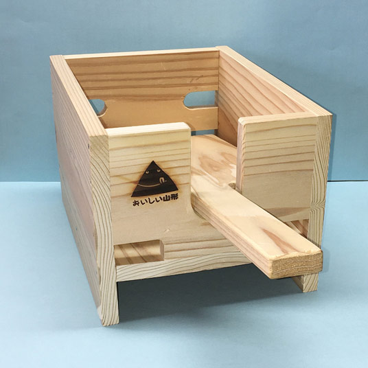 豆腐箱は、河北町にある吉田木工さんとコラボして作りました。山形の厳しい自然の中で育った杉の間伐材などの木材を利用しています。