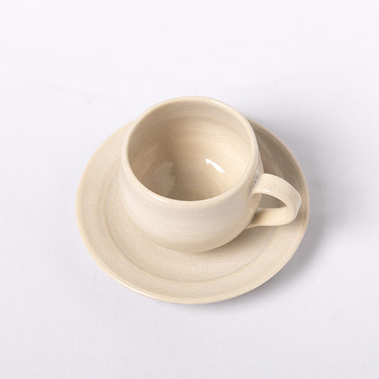 萩古来の土を使い作陶した、コーヒーカップとソーサーのセットです。手取りが軽く飲みやすい作品です。