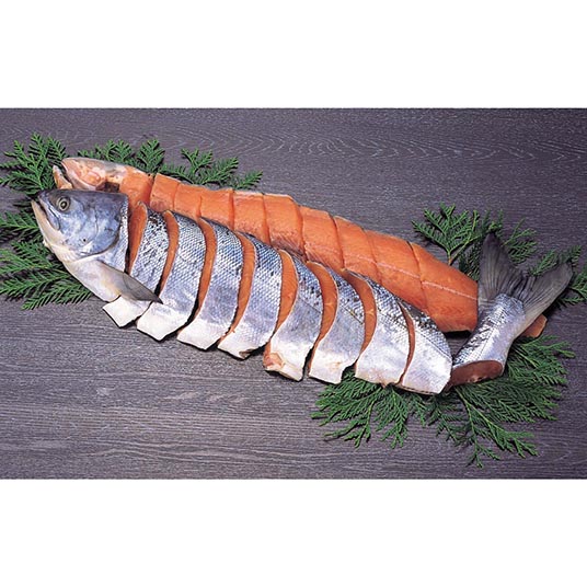 新巻鮭は鮭の内臓を取り出して、塩漬けにした保存食です。塩漬けにすることで鮭の余分な水分が抜け、うまみが高まります。鮭が多く取れる地方では昔から正月の縁起物として親しまれてきました。
