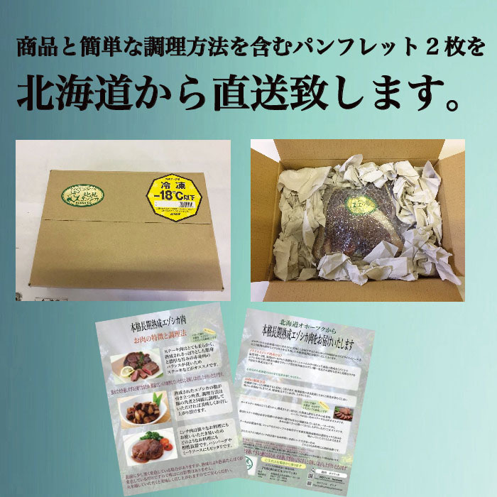 ステーキ肉はバターや少し多めの油でサッと焼いてお召し上がりいただくのがおすすめです。お醤油や塩、コショウなどのシンプルな味付けで、本格長期熟成シカ肉の濃厚なコクとうまみを味わう事ができます。強火で火を通しすぎると固くなるため、低温でじっくり加熱するとおいしく召し上がることができます。※天然のエゾシカ肉のため、必ず加熱してお召し上がりください。