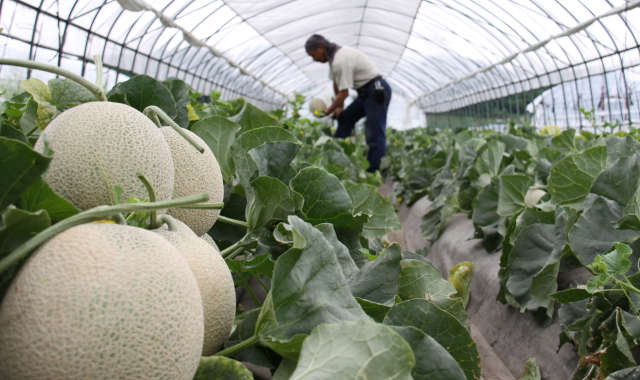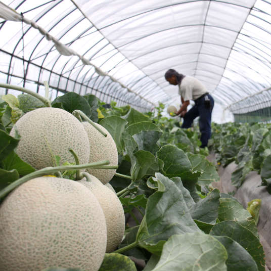 北見メロンの栽培は、氷点下まで冷え込む2月から始まります。オホーツクの肥沃な土壌で長く厳しい冬を乗り越え、最高品質のメロンを育成するために、ハウスの水やりや雑草取りなど生産者が手間ひまかけて育てています。
