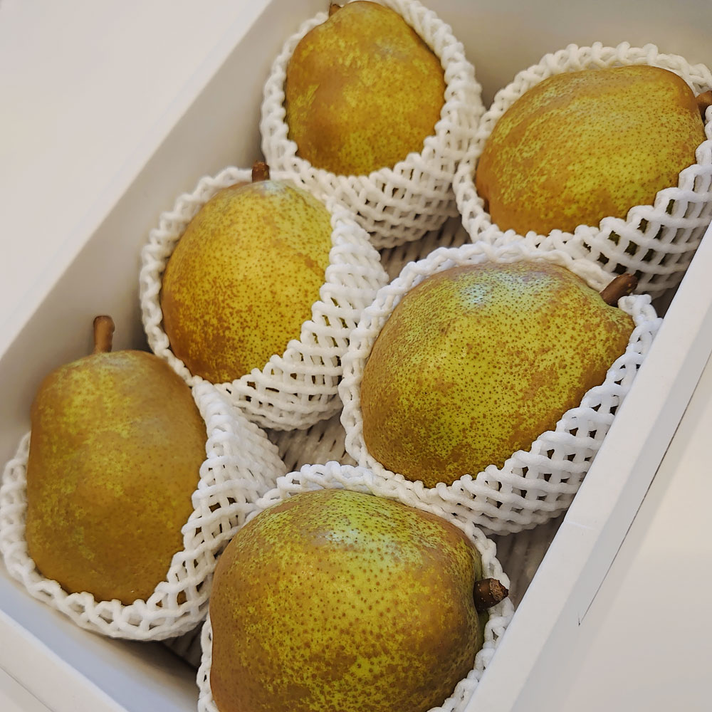 一般的なラ・フランス食べごろの目安は、軸の周りを押して柔らかくなった頃がもっとも甘さが引き立ちます。旬果工房では遅もぎした果実を追熟し、食べごろの果実がお客さまのもとに届くように発送しています。
