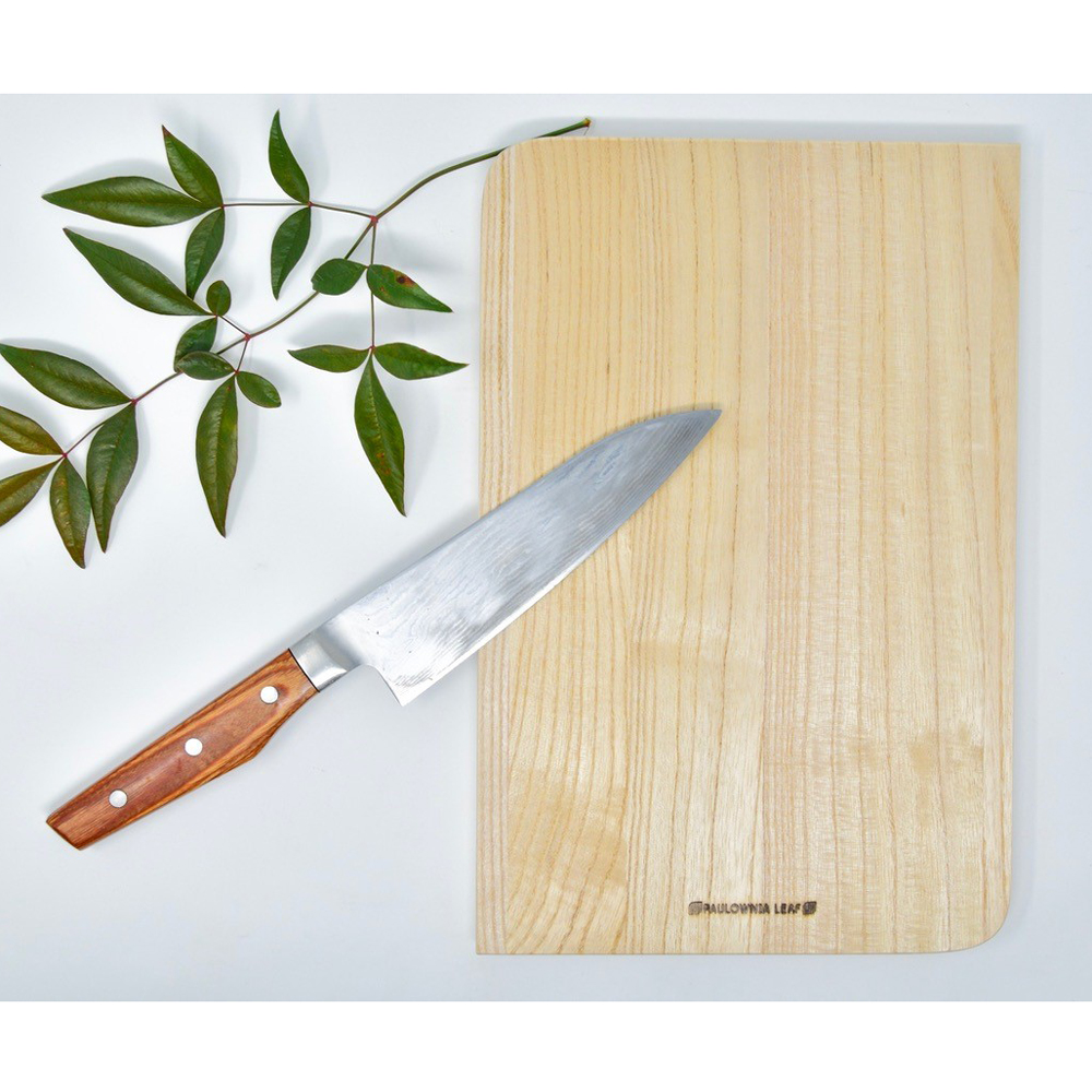 桐は軽くてとても扱いやすく、虫や菌が繁殖しにくい成分を多く含むので、まな板として最適です。刃あたりも優しく包丁が刃こぼれしません。水の乾きにとても早く、清潔に保つことができます。桐に多く含まれるタンニンは水による腐食耐性が高く、水回りにも安心して使える木材です。