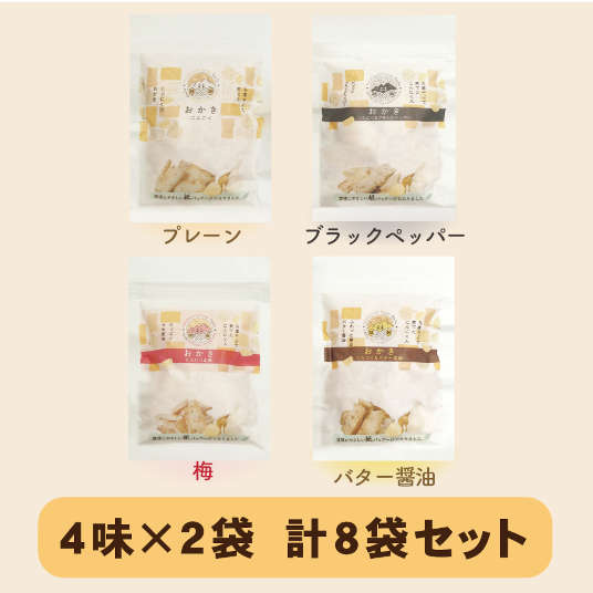 【内容量】全4味×2袋ずつはいったアソートパックです。(プレーン味:50g×2袋、ブラックペッパー味:50g×2袋、梅味:50g×2袋、バター醤油味 :50g×2袋)
