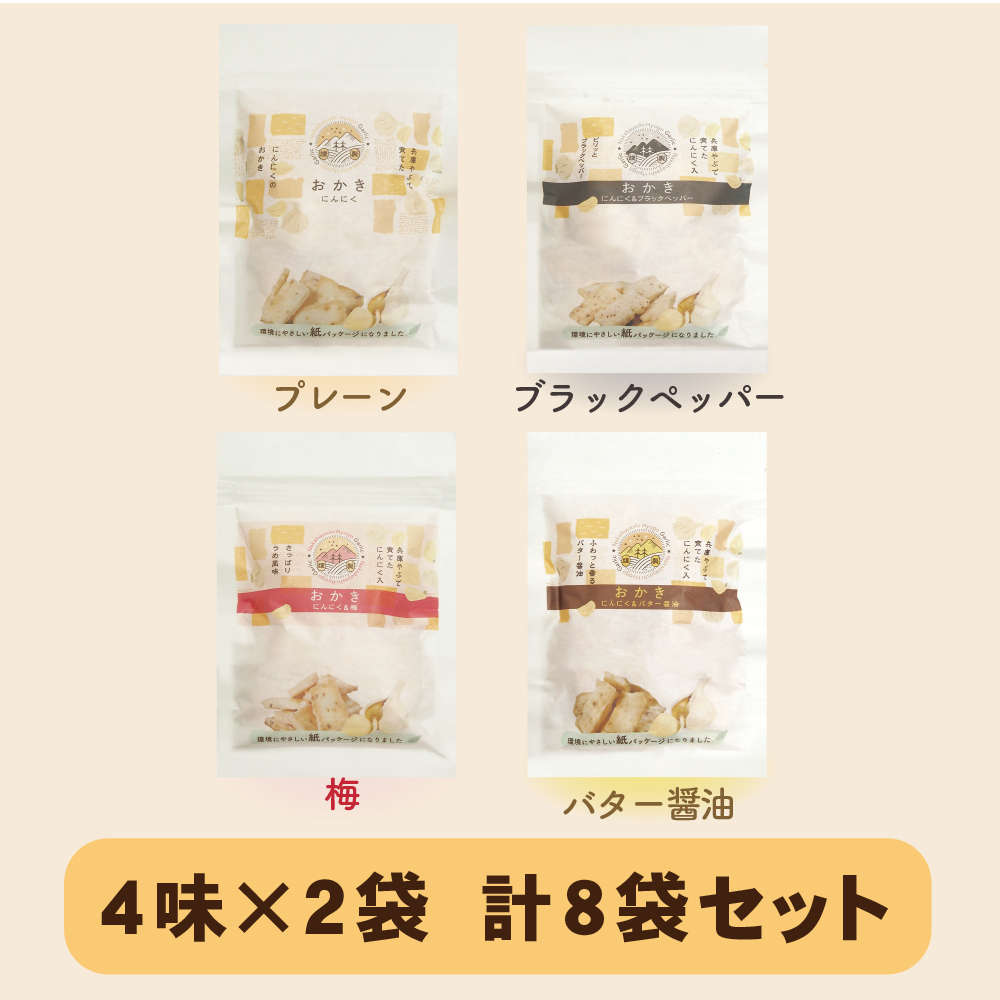 ・にんにくおかきプレーン味:もち米(国産)、植物油脂、ガーリックパウダー、ローストガーリックチップ(ニンニク(兵庫県養父市産))、食塩、香辛料(大豆を含む)、チキンコンソメパウダー(乳成分・小麦・鶏肉を含む)/調味料(アミノ酸等)、着色料(カラメル)、酸味料、香辛料抽出物