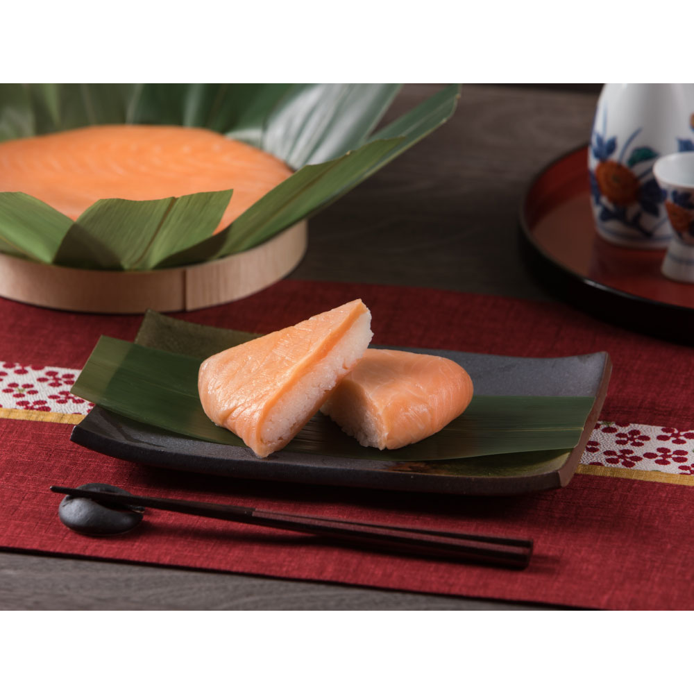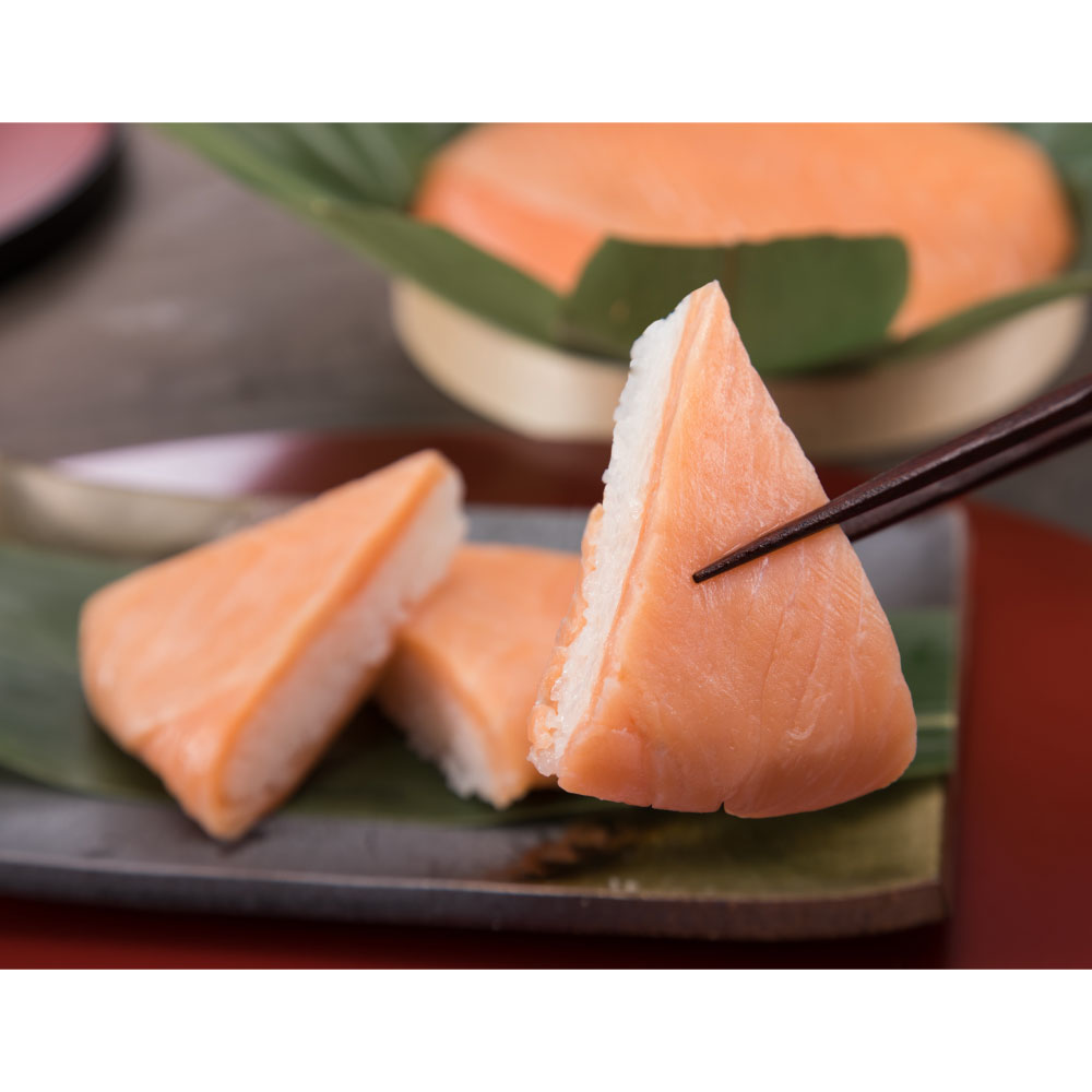通常のます寿しと比べて約2倍の量のマスを使用しているため、すし飯の表面だけでなく、側面や裏側までマスが入っています。酢飯の下にマスを敷く伝統的な「逆さ造り製法」で仕上げているので、マスのうまみが酢飯に逃げず、凝縮されたおいしさに仕上がります。すし飯にはこだわりの富山県産コシヒカリを使用し、脂の乗った肉厚のますを秘伝の酢でとろけるうまさに仕上げました。ひと味違う極上のます寿しをぜひご賞味ください。