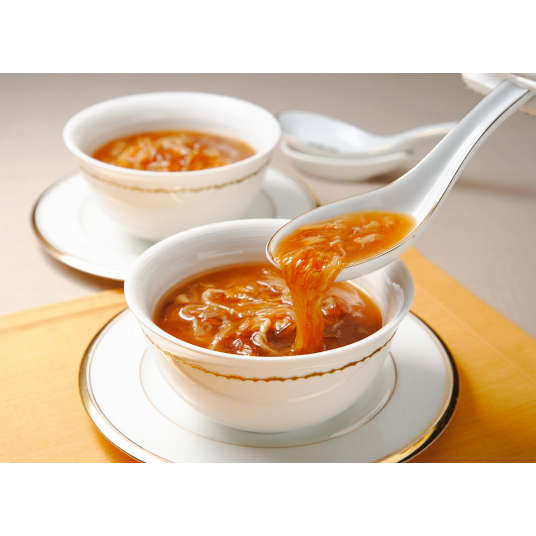 【素材】ふかひれ(気仙沼産)、ガラスープ(鶏肉を含む)、ショウガ、紹興酒、ごま油、オニオンエキス、醤油(小麦・大豆を含む)、砂糖、食塩、オイスターソース、貝エキス、ポークエキス、たん白加水分解物/増粘剤(加工デンプン、キサンタンガム)、調味料(アミノ酸等)、香辛料抽出物、カラメル色素
