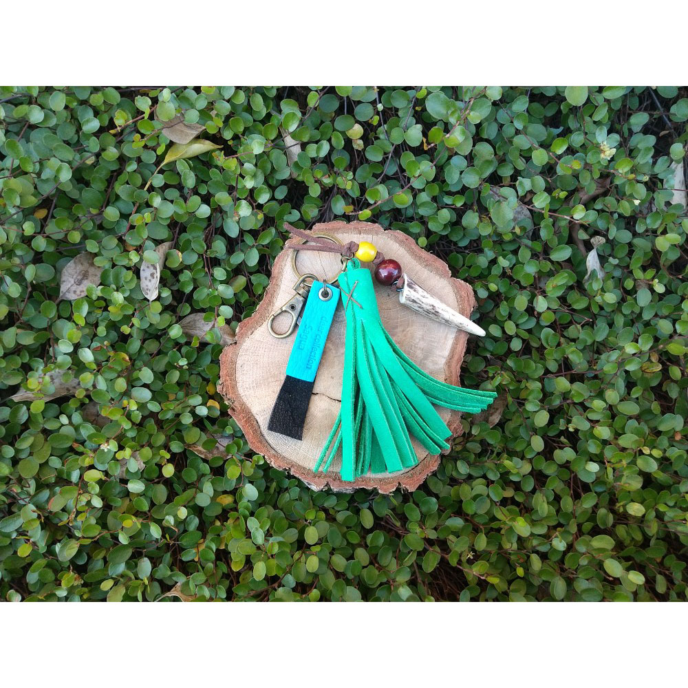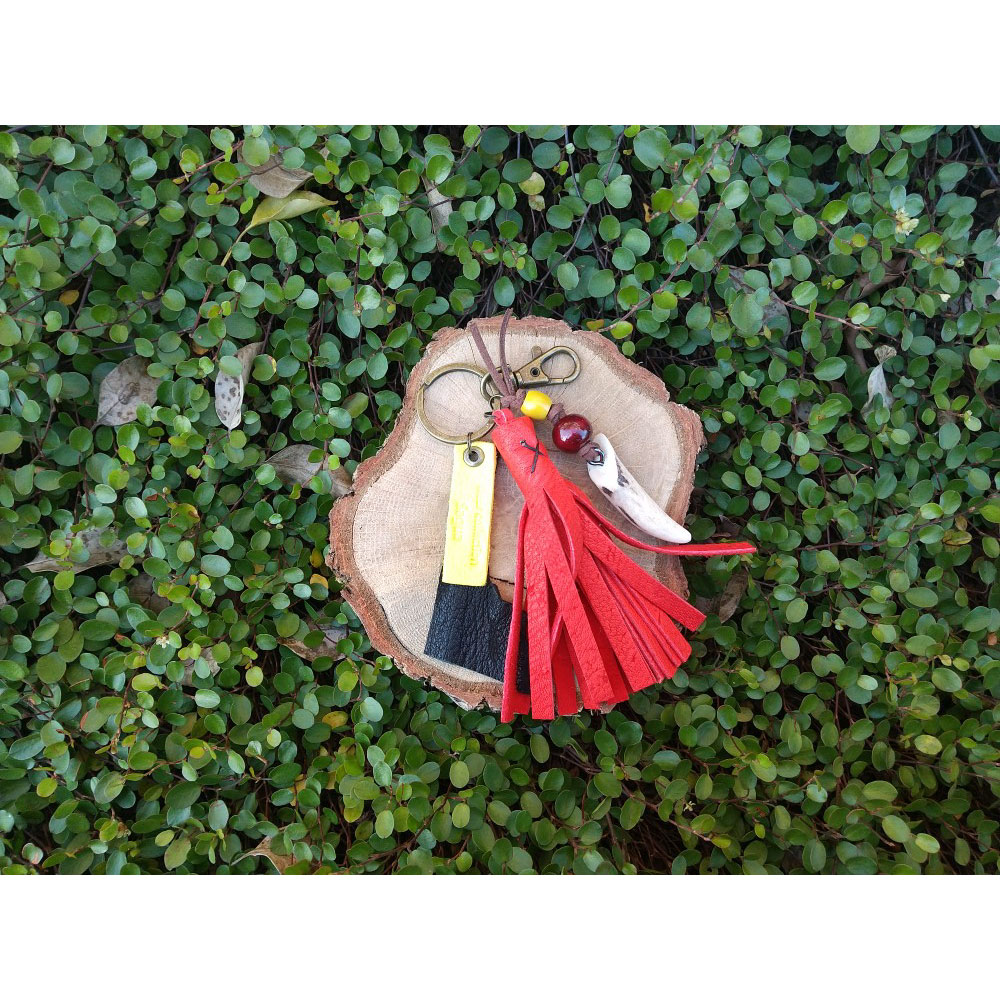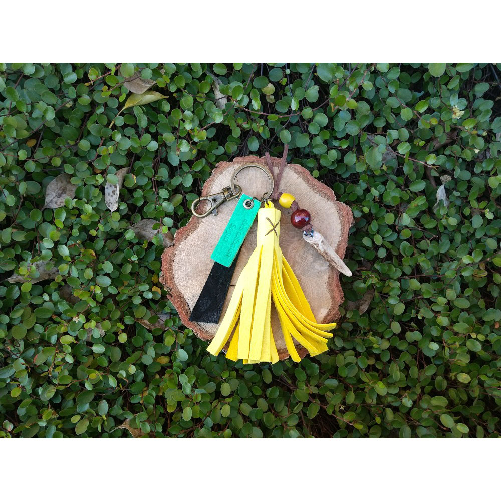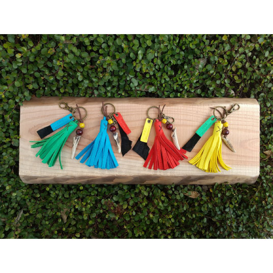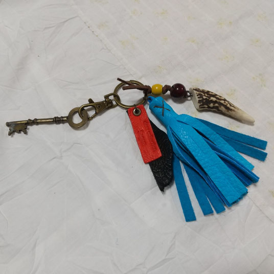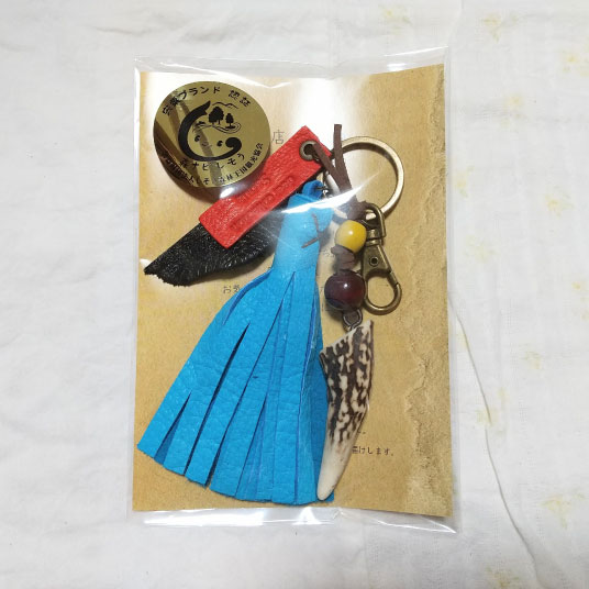 害獣として捕獲される兵庫県宍粟(しそう)市のニホンジカの皮を有効活用した鹿革タッセルチャーム。1本1本ヤスリがけをした鹿の角とウッドビーズをあしらったモンベル・フレンドマーケット限定デザインです。