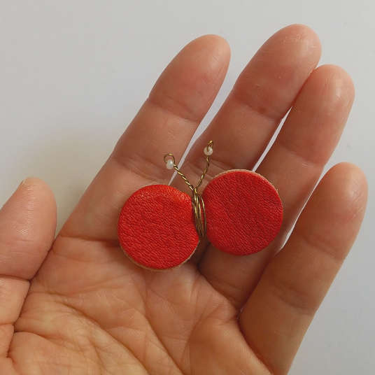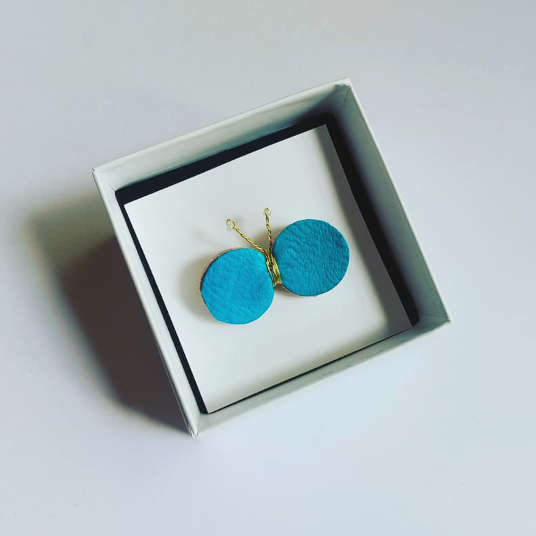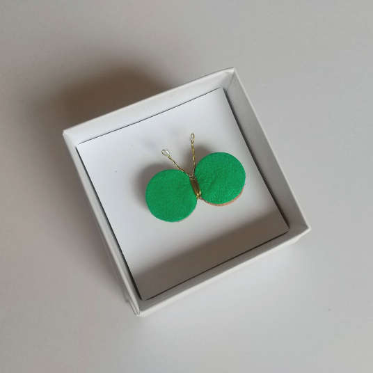 Saguaでは環境に無害のポルティラ製法で皮から革へ鞣し、クチナシ、ラック、ヤマモモ、クマササなどの天然染料を使用し、Saguaオリジナルカラーへと染色します。やわらかく、ふわふわしたちょうちょの羽と、キラリと光るワイヤーは真鍮製を使用、触覚にはビーズを使用しています。少しならワイヤーを動かす事が可能です。2枚の鹿革を合わせることで、厚みが増し立体感と存在感を出すことができました。自然界を生きた証、木に体をこすったキズの部分などもそのまま作品にし、ちょうちょの羽の柄になるように型を抜いているものもあります。発がん性物質を含まないアゾフリー染色で、ヒト、動物、地球に無害であることを心掛けた、SDGs(持続可能な開発目標)を考えた鹿革です。