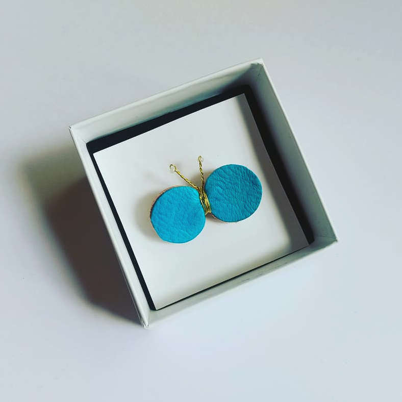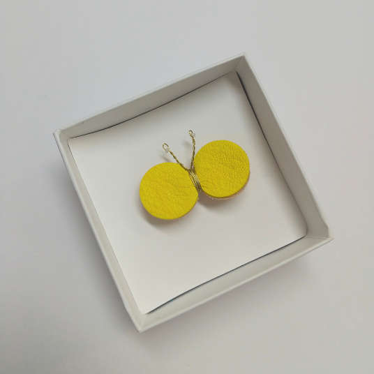 里山のちょうちょブローチは、洋服や帽子・鞄・マフラーなどさまざまな場所に可愛らしく付けていただけます。天然素材なので、洋服のジャンルを問わず身に付けることができ、着物の帯留めにも似合う作品です。サイズは、大きいちょうちょ・小さいちょうちょの2種あり、大小2つのちょうちょブローチを並べて付けることもいかがでしょうか。宍粟の豊かな里山を舞う、鮮やかなちょうちょたちをイメージした存在感のある鹿革ブローチです。