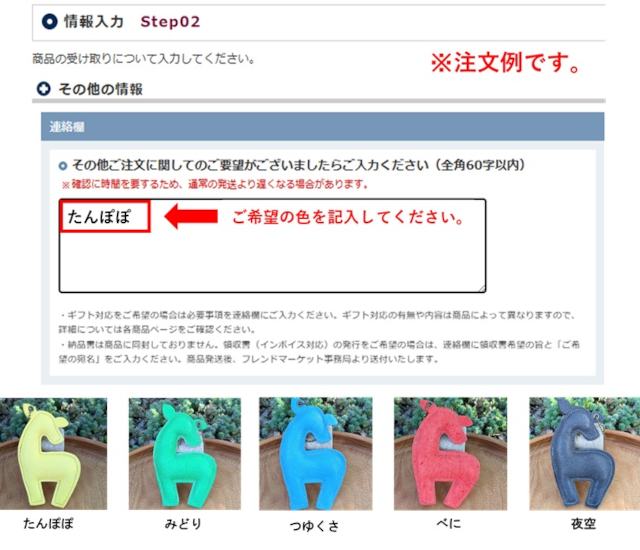 ご注文画面の「連絡欄」に、ご希望の色をご記入ください。