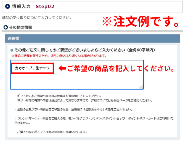 ご注文画面の「連絡欄」に、ご希望の2種をご記入ください。詳細情報に注文例を表示しています。