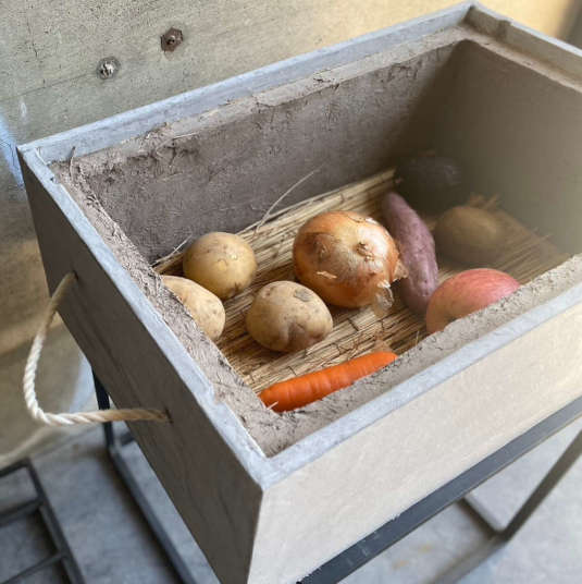 日本左官の伝統的な土壁仕上げを施した小さな野菜蔵です。土のちからで野菜の美味しさを長持ちさせます。