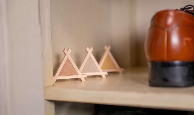 土を扱う左官職人と、木を扱う建具職人。職人同士がタッグを組み、消臭&調湿オーナメントを完成させました。土は消臭効果と調湿性能、ひのきは防カビ性能と抗菌作用の効果を発揮します。土と木の良さを手軽に体感できるオーナメントです。