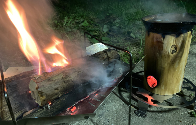 焚火台で薪を燃やして直火の調理台に、横にスウェーデントーチを置けばコンロ代わりとなり、鍋やスキレットを使用して別々の調理法同時に楽しむことができます。