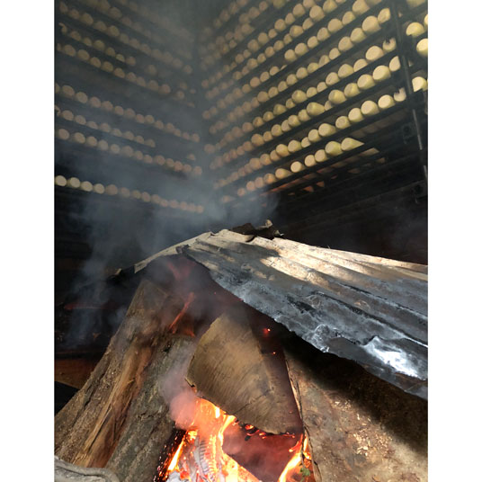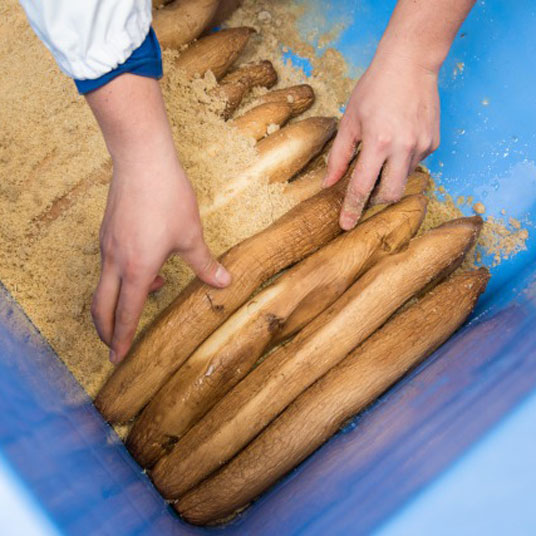 奥羽山脈の裾野に広がる広大な敷地で自社で育てたダイコンを、室町時代から続く昔ながらの製法で桜・林檎の木を燃やして3昼夜燻製乾燥し、こだわりの製法で漬け込みました。添加物は使用しておらず、米糠に塩、砂糖などを加えた独自の製法により、従来にないマイルドな味わいに仕上がりました。飽きのこない、いくらでも食べられるやさしい味わいが人気です。いぶり漬特有のスモーキーで深みのある味わいをご堪能ください。