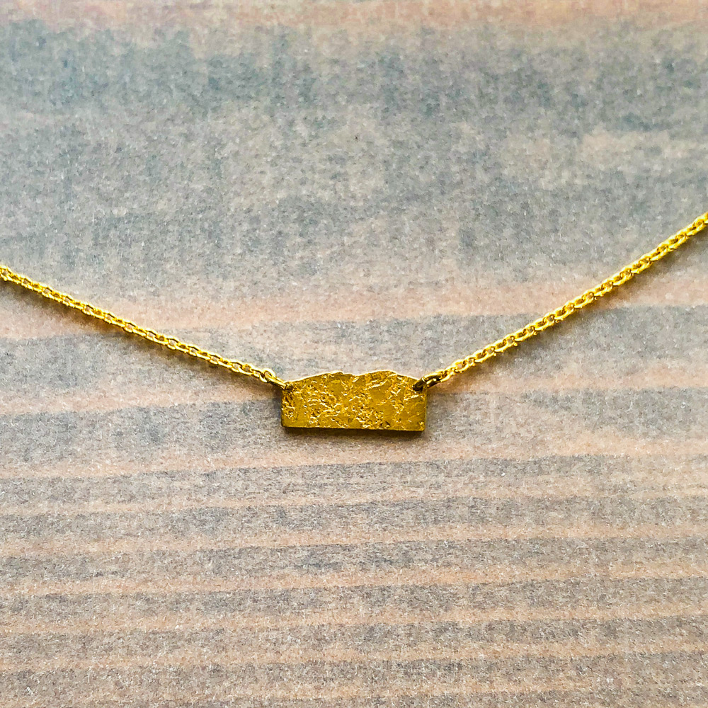 このネックレスは、山に愛着をもつ山形の方々に接する中で「それぞれが愛する山をお守りのように身に着けてもらいたい」と思い制作しました。山の写真から型紙をつくり、金属板に写し取って一つ一つ手作業で切り出し仕上げています。肌に触れた際に痛みや違和感がないようかすかな板の角も落とすなど、手作業だからこそできる仕上げを大切にしています。