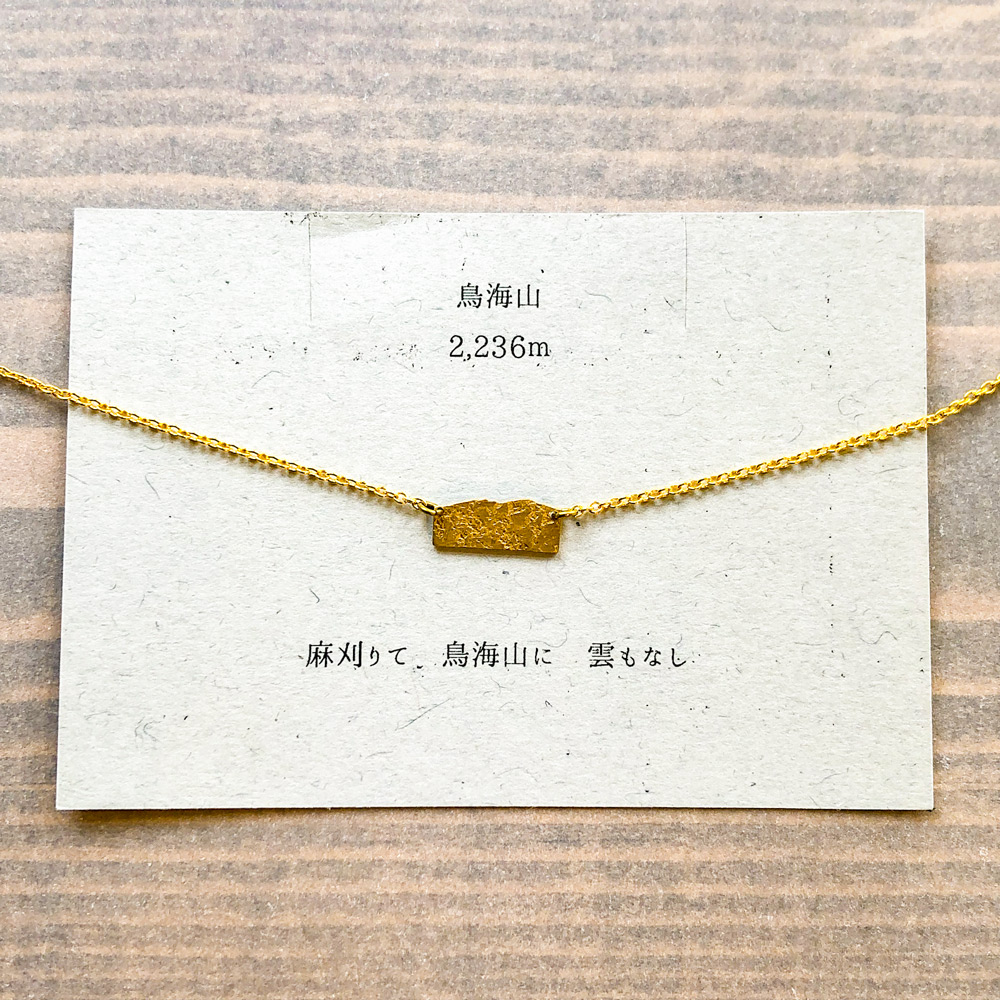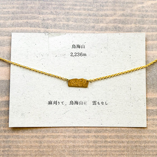 山形を代表する名峰「鳥海山」の稜線をかたどった繊細な作りの真ちゅう製ネックレスです。台紙には、標高と山にゆかりのある正岡子規の歌を添えました。