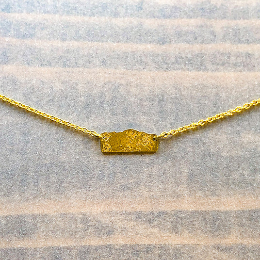 このネックレスは、山に愛着をもつ山形の方々に接する中で「それぞれが愛する山をお守りのように身に着けてもらいたい」と思い制作しました。山の写真から型紙をつくり、金属板に写し取って一つ一つ手作業で切り出し仕上げています。肌に触れた際に痛みや違和感がないようかすかな板の角も落とすなど、手作業だからこそできる仕上げを大切にしています。