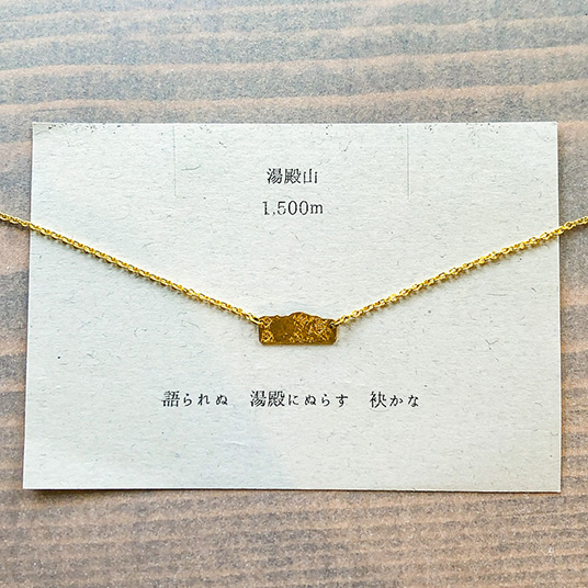 山形を代表する名峰「湯殿山」の稜線をかたどった繊細な作りの真ちゅう製ネックレスです。台紙には、標高と山にゆかりのある芭蕉の歌を添えました。